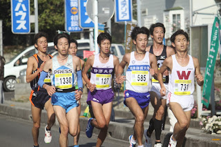 By 15 km the lead group was down to thirty, all university men in the hunt for both places on their schools' Hakone Ekiden teams and tickets to New York except for former Hakone Ekiden Select Team teammates Aritaka Kajiwara (Team Press Kogyo) and Yuki Kawauchi (Saitama Pref. Gov't).