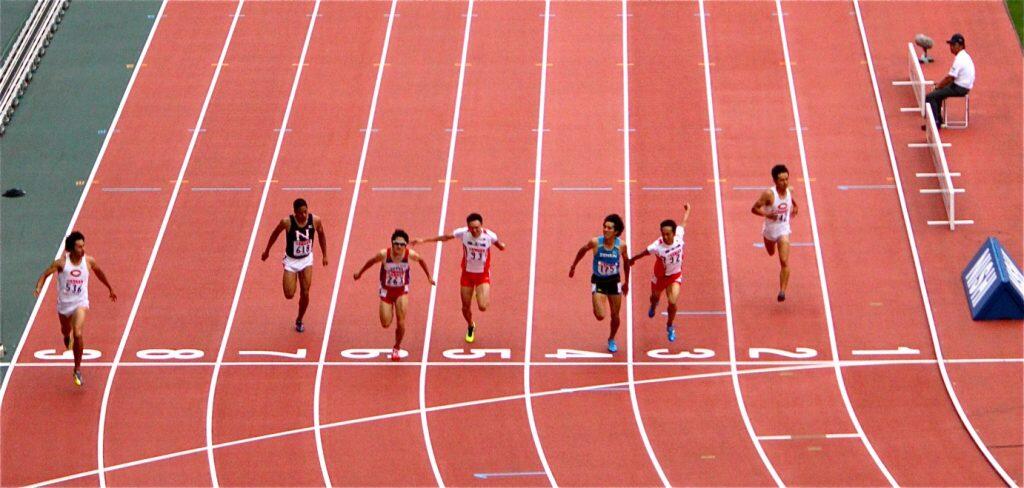 Iizuka led five men under the 20.52 A-standard, winning in 20.31 (+0.9) to secure his position. Yuichi Kobayashi (Team NTN) ran a PB 20.46 in 2nd and Kei Takase (Team Fujitsu) clocked 20.48 for 3rd, both putting themselves into solid consideration for the team. Kishimoto had a mid-race scare from the ascendant Yasuhiro Fueki (Team Aima) who overtook him on the back curve only to fall victim to Kishimoto's closing speed. Kishimoto took 1st in 49.08 with Fueki 2nd in an A-standard PB 49.31, like Kobayashi and Takase getting onto the shortlist for Moscow team membership.
