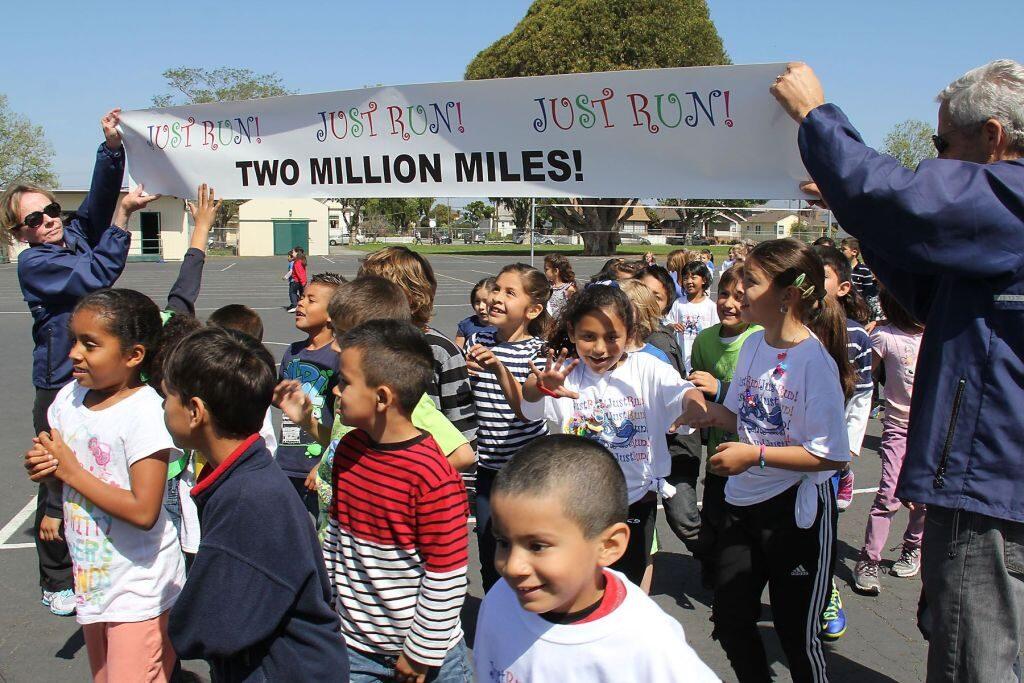 Surpassing the two million mile mark was cause for celebration. JUST RUN staff and leaders joined Monterey County Superintendent of Schools, Nancy Kotowski, in congratulating the student body at Lincoln School in Salinas, CA. Nearly 500 students cheered for the program's success and ran a celebratory lap in honor of the achievement.
