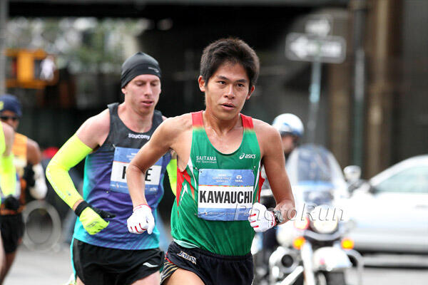 Earlier in the morning at the U.S.A. at the Texas Relays track meet in Austin, Texas, Kawauchi's fellow Saitama prefecture resident Yoshihide Kiryu (19, Toyo University) ran a wind-assisted time of 9.87 in the men's 100 m.  Kawauchi didn't hear about Kiryu's run until after his own race but was very excited when he heard the time, saying, "He finally did it!  I had no idea."  When told that the wind reading was 3.3 m/s Kawauchi sighed, "Gah!" but sent Kiryu his encouragement, saying, "This will serve as a major stimulus for him.  Even if his time wasn't legal because of the wind, it's really important that he got the experience of running that kind of speed once.