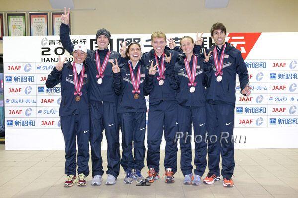 Olympic 10000 m medalist Galen Rupp won his stage to bring the U.S.A close to the leaders but could not improve his team's position, the U.S.A. taking 3rd in 2:06:36. Russia, the Japanese University Select Team, Canada, New Zealand and hosts Chiba Prefecture rounded out the top eight, with New Zealand's twins Jake and Zane Robertson winning their stages.
