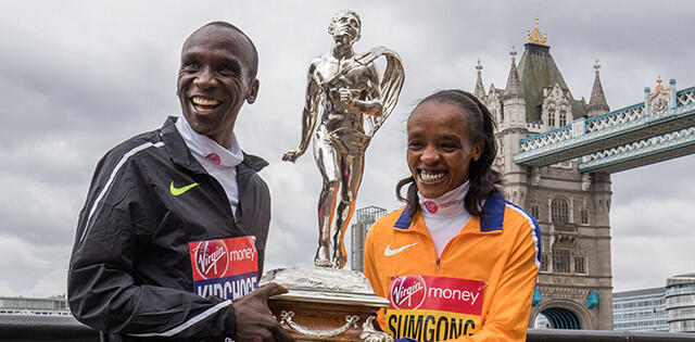 The women’s elite race also featured gripping head-to-head contests and clashes. Champion Jemima Sumgong joined Kipchoge on stage, alongside the giant Chris Brasher Memorial trophy, to reflect on her success.