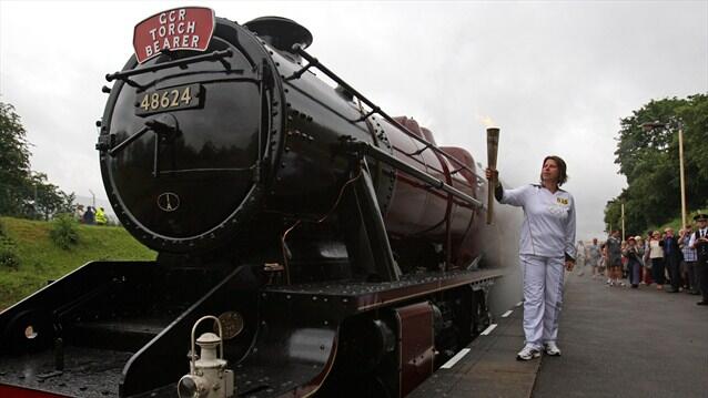 The Flame takes a journey on The Great Central Railway - Torchbearer Angela Conibear holds the Olympic Flame next to a steam train before the Flame takes a journey on the Great Central Railway during Day 46 of the London 2012 Olympic Torch Relay. ©LONDON 2012