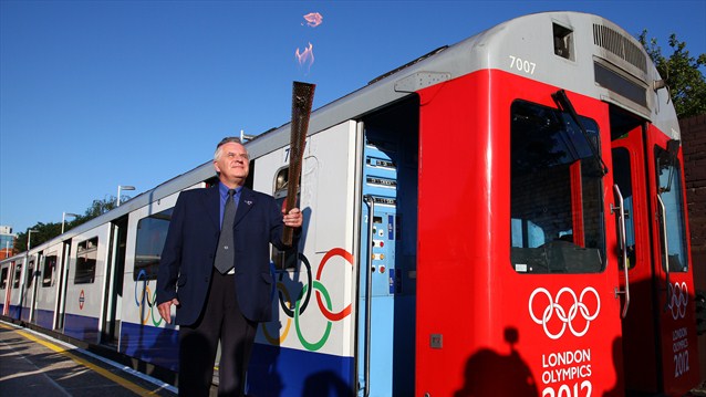 The Olympic Flame takes the London Underground - Torchbearer John Light carries the Olympic Flame onto a London Underground train at Wimbledon station. ©LONDON 2012