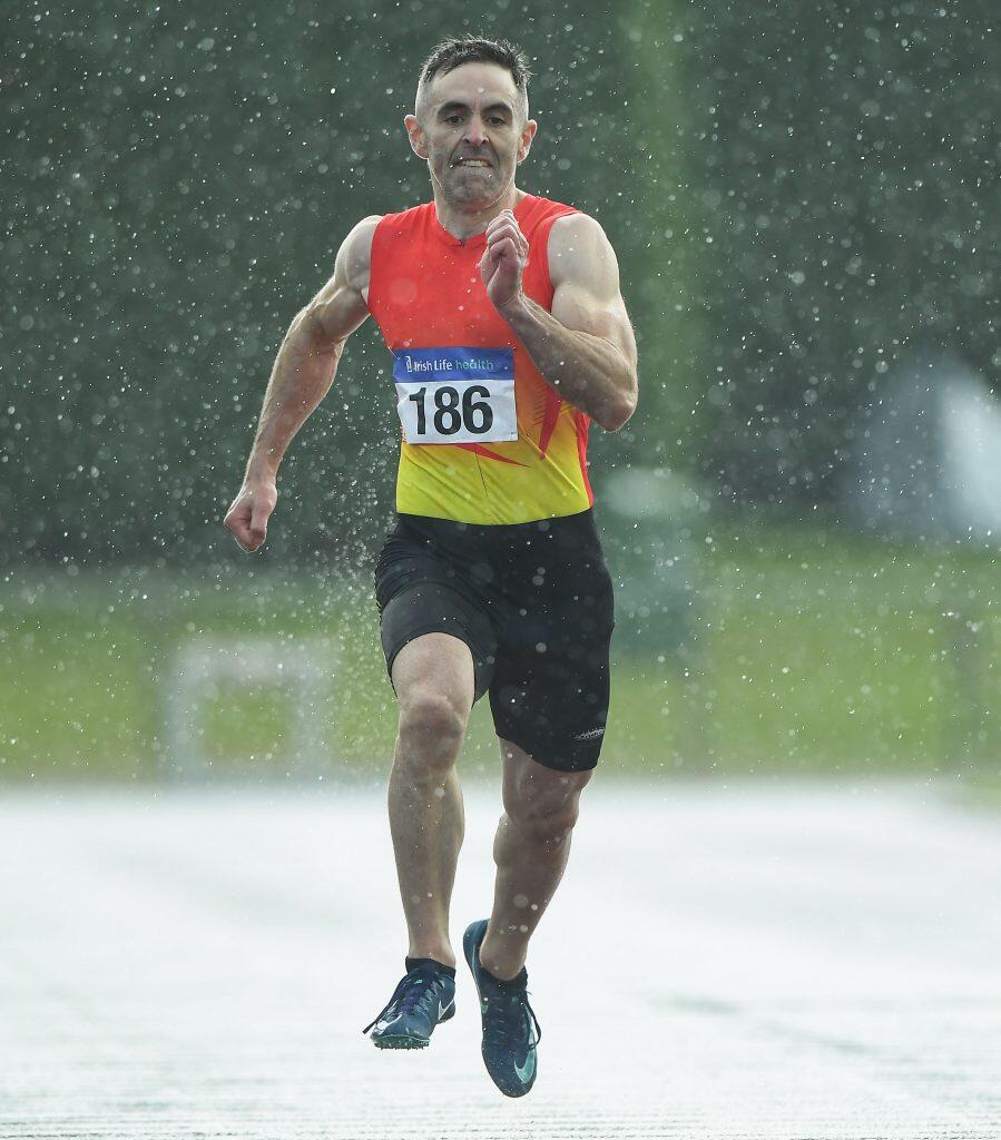 18 August 2019; Glen Scullion from Mid Ulster A.C. who won the mens over 40's 200m during the Irish Life Health National Masters Track and Field Championships at Tullamore Harriers Stadium in Tullamore, Co Offaly. Photo by Matt Browne/Sportsfile