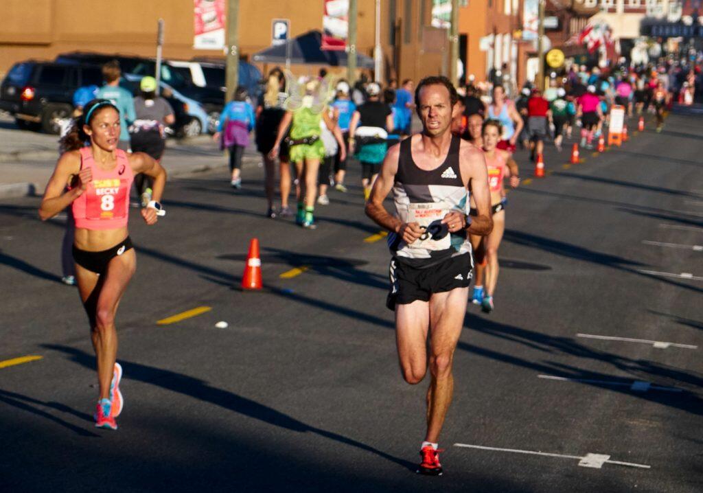 Aaron Braun overtakes Becky Wade along Cannery Row on his quest to be the first finisher across the line for the $5,000 equalizer bonus in the 14th annual Half Marathon on Monterey Bay. © Kaori Photo