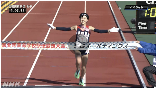 Nagano Higashi covered the complete 5-stage, 21.0975 km course in 1:07:37 to become the first girls‘ team from Nagano prefecture ever to take the national title. Sendai Ikuei was next in 1:07:51, with Kamimura Gakuen 3rd in 1:08:03 after spending the entire race recovering from a shaky start by lead runner Airi Tashima. Last year’s runner-up Kunei Joshi Gakuin H.S. was 6th in 1:08:42 after leading the first leg thanks to a great run from Kana Mizumoto.
