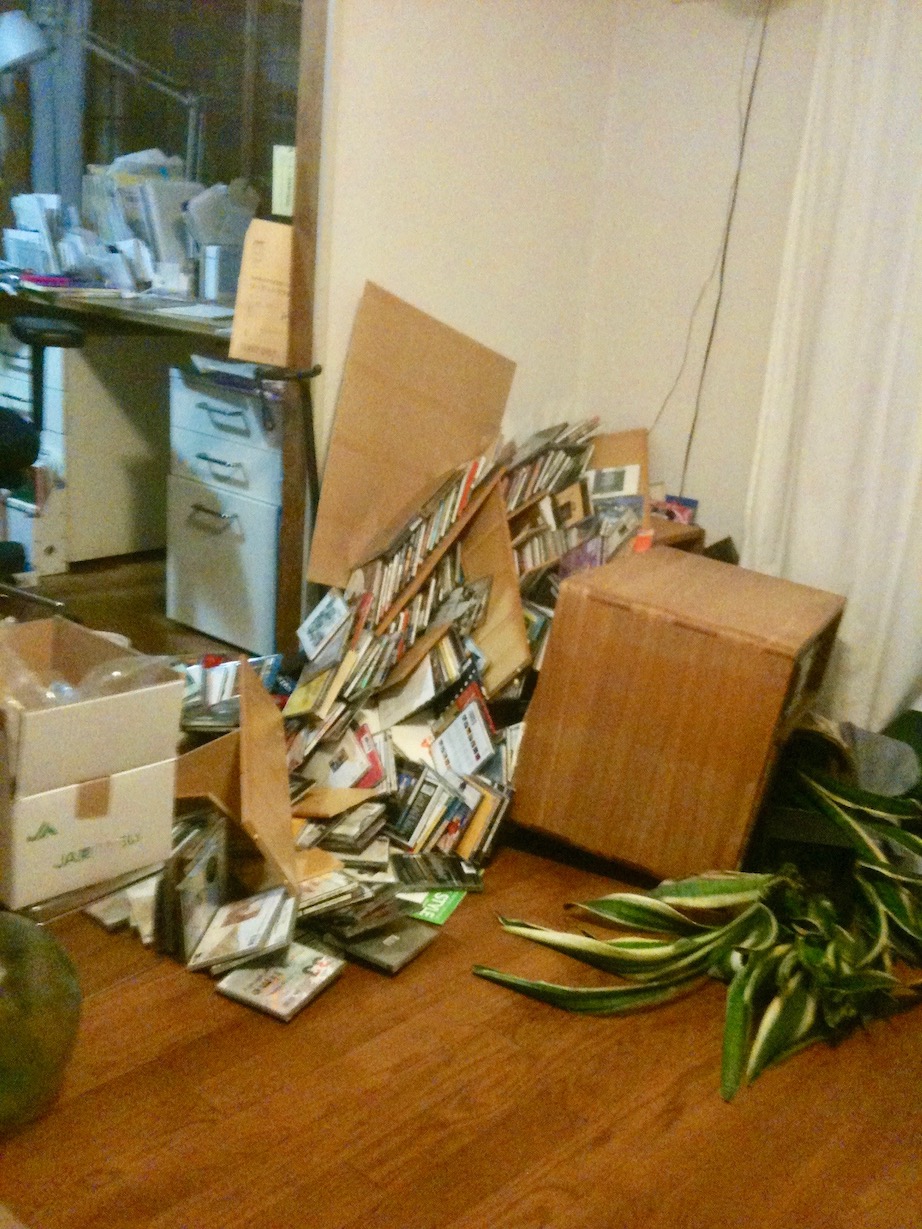 We got there just in time to see the raging black mountains sweeping across the fields of Miyagi on the TV screens in the station filled with silent people watching. Giving up on our meeting we decided to go home, briefly considering a taxi but, looking at the stream of people starting to spill out of surrounding office buildings into the street, opting to walk. It took about two hours, and by the time we got to Harajuku on the other side of the park from our apartment it was already full of people trying to figure out how to get home without the trains running. We got to ours, on the 7th floor of an old 12-story building, to find one of our glass sliding doors shattered and a couple of shelves and cabinets knocked over.