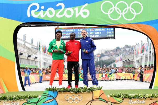 No real surprises in the men's marathon to wrap up the Rio de Janeiro Olympics. Berlin and London Marathon winner Eliud Kipchoge (Kenya) for gold, Tokyo Marathon winner Feyisa Lilesa (Ethiopia) for silver, Galen Rupp (U.S.A.) stepping up for a medal in bronze, world champion Ghirmay Ghebreslassie (Eritrea) just missing the podium, DNFs for Kenyan and Ethiopian B-men Stanley Biwott and Tesfaye Abera, and irrelevant performances from the Japanese men.