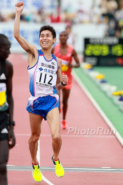 Maruyama kept pushing even after he started to pay for his early surge and came home in 6th with a solid debut of 2:09:39, just beating the debut times of marathon NR holder Toshinari Takaoka and half marathon NR holder Atsushi Sato in the record books. Kitata paid much more dearly, dropping to 16th in 2:16:09. Nakamoto, the top Japanese man in the London Olympics and Moscow World Championships, was 7th onto the track, but like the ghost of marathons past Kawauchi hauled on just behind him, catching Nakamoto with 300 m to go and stealing 7th in 2:11:53, his best time since before his December, 2014 ankle injury.