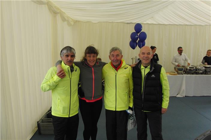 Pictured from left: Bashir Hussain, Jackie Newton, Ron Hill and Steve Kenyon who made up the Running Legends team at the Greater Manchester Marathon in 2015. ©run britain