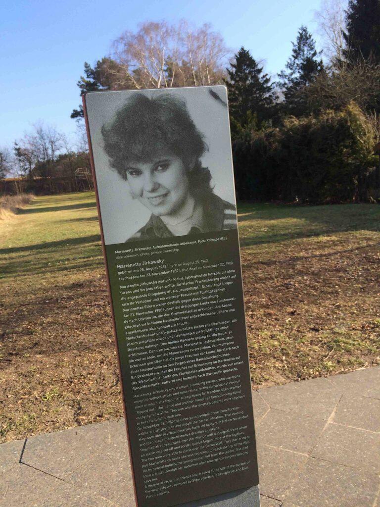 This year the 100Meilen commemorate Marienetta Jirkowsky. She died at the age of only 18 in the year 1980 during the attempt to overcome the border fortifications in Hohen Neuendorf. Here, where once the deadly shots were fired, is now a memorial.