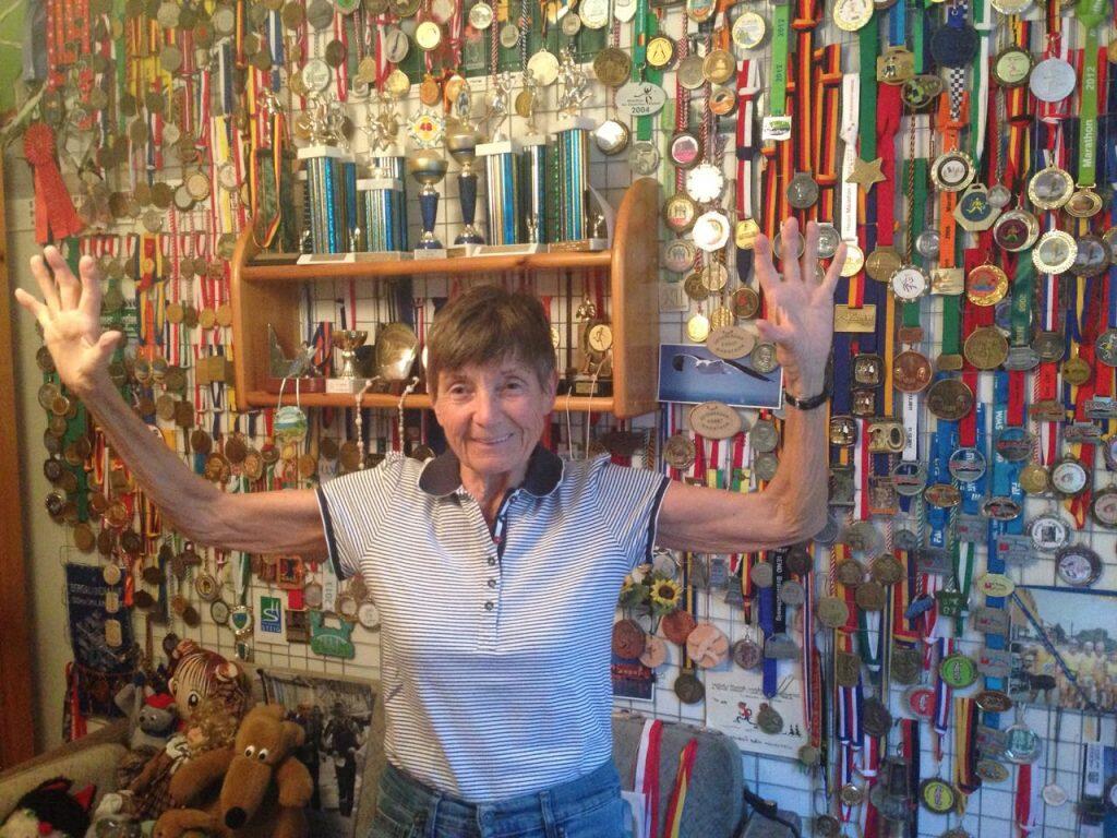 Siegrid Eichner with her medals -Last year Sigrid Eichner, 73 years old back then, has been the oldest participant. In an interview with the journal “Spiegel” a few months ago, when the Berliner was asked about her goals, she responded: to finish and not to be the last one. ©100 Miles Berlin - The wall race
