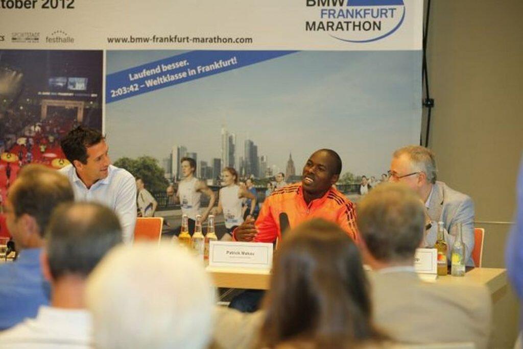 Patrick Makau at the press conference yesterday with Christoph Kopp (r.) ©Frankfurt Marathon.