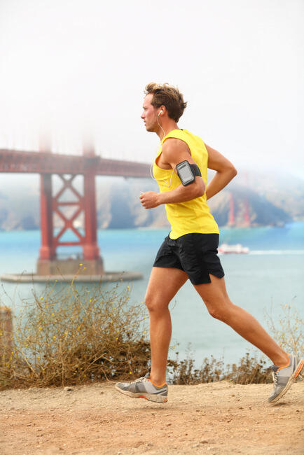 Man jogging - male running in San Francisco. Sporty fit young man jogger along a dirt track alongside San Francisco Bay and Golden Gate Bridge. Runner listening to training music from smartphone.