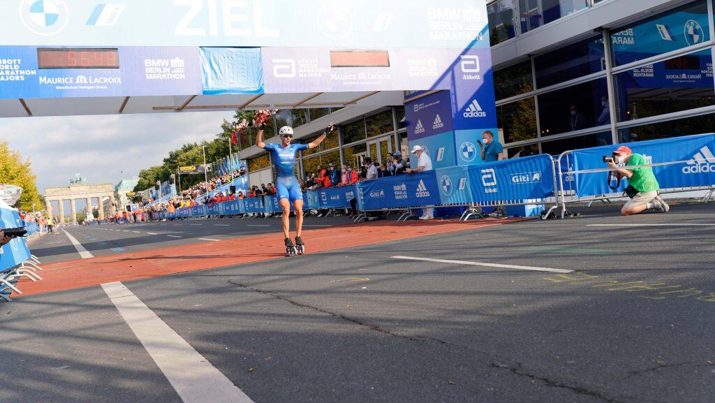 Bart Swings and Sandrine Tas led the Powerslide Matter team to the top of the inline skating charts as #restartskating got underway in Saturday’s event at the BMW BERLIN-MARATHON Inine Skating. Swings from Belgium celebrated his seventh win in the city’s skating marathon, failing to break his own course record by just one second when he crossed the line in 56:50. His compatriot Sandrine Tas increased the Powerslide Matter team’s joy by winning a sprint finish in 1:13:40.