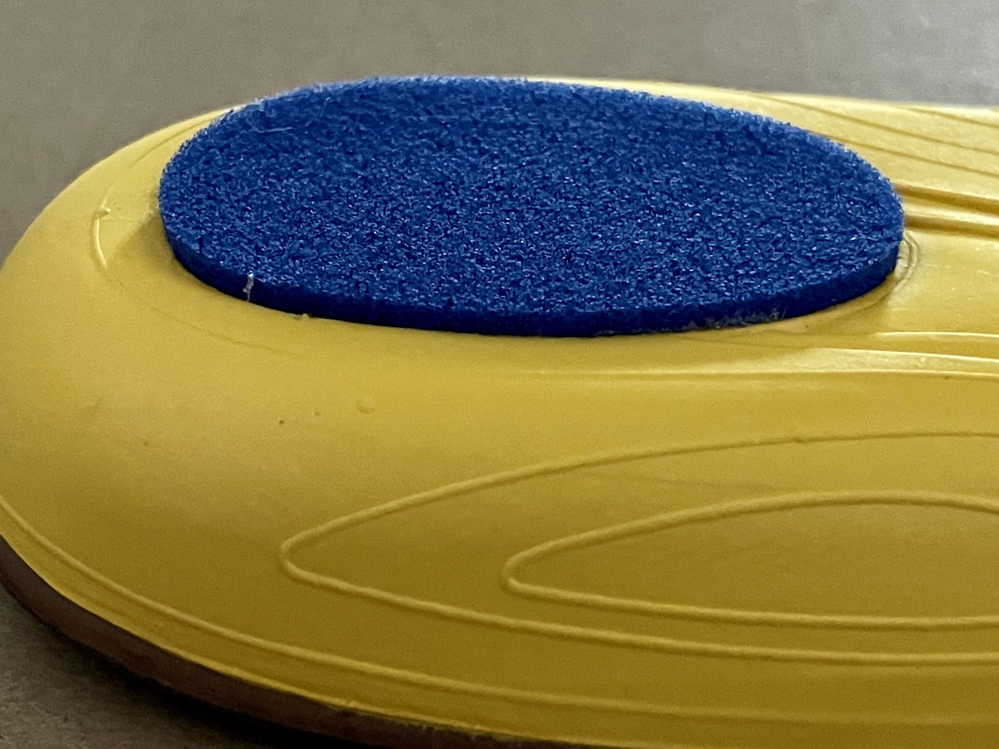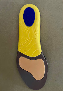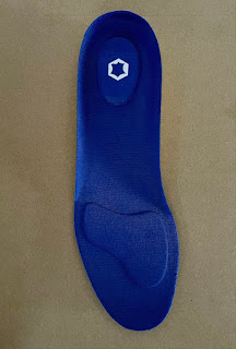 The non-impact parts of the forefoot and the upper edge all the way around are a light foam material, with a denser silicone wedge under the ball of the foot that actually stands out slightly on the top of the insole. The arch and heel are a harder foam that extends upward on both sides to continue the lines of the midsole in the arch. Directly under the heel on both the top and bottom of the insole is a very soft and thick oval of additional cushioning.