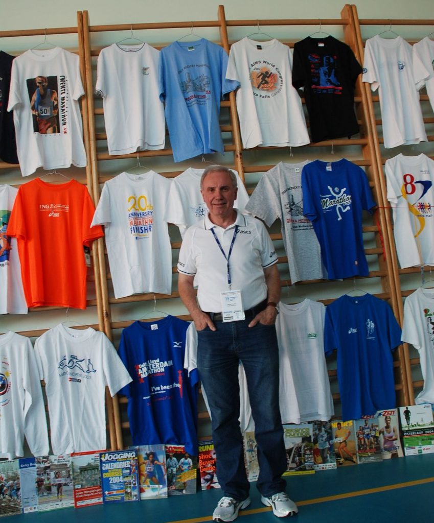 In a large room near the half marathon race number pick-up in the gym of a school, an exhibition of his collected "works" from around the world was presented: about 100 t-shirts were hung on the stall bars, and lined up below them in a long row were magazines and programmes from races around the world beginning in the mid-1970s; there were also unusual finds, such as medals and race numbers from Japan. His Japanese collection was enhanced with numerous decorative fans, which were given away as souvenirs at the races.