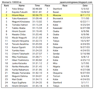 Japanese women didn't set any major national records this year, but in general things were trending in the right direction to reverse the slide in quality over the last generation, with multiple all-time top 25 performances at 5000 m, half marathon and the marathon and IAAF bronze label or better wins at overseas marathons including Rotterdam, Zurich and the Gold Coast.