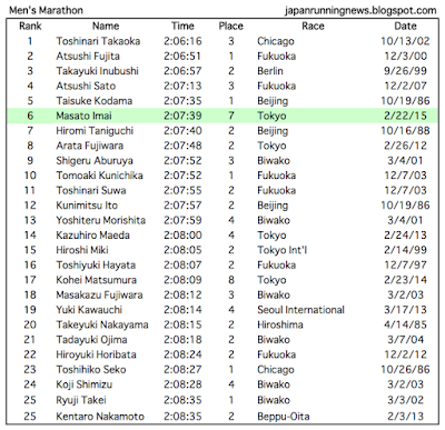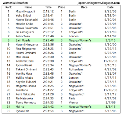 Rounding out JRN's top three behind the young Maeda and Suzuki, Mai Ito took #3 for the year thanks to a sub-1:10 PB for 2nd at the National Corporate Half Marathon Championships and her 2:24:42 behind Maeda in Nagoya, cracking the all-time Japanese top 25. Ito came through in Beijing as the top Japanese woman at 7th in 2:29:48, clearing the JAAF's top 8 criterion for auto-selection to the Rio de Janeiro Olympic team. The year's top 25 Japanese women: