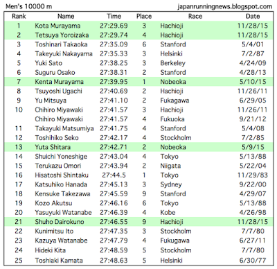 10000 m: Kota Murayama – 27:29.69 (Hachioji, 11/28/15)