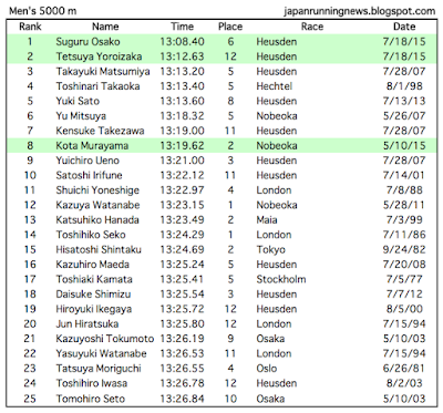Looking at the Japanese all-time top 25 for the four major outdoor distances things were even better. Green marks were set in 2015: