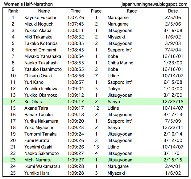 Rounding out JRN's top three behind the young Maeda and Suzuki, Mai Ito took #3 for the year thanks to a sub-1:10 PB for 2nd at the National Corporate Half Marathon Championships and her 2:24:42 behind Maeda in Nagoya, cracking the all-time Japanese top 25. Ito came through in Beijing as the top Japanese woman at 7th in 2:29:48, clearing the JAAF's top 8 criterion for auto-selection to the Rio de Janeiro Olympic team. The year's top 25 Japanese women:
