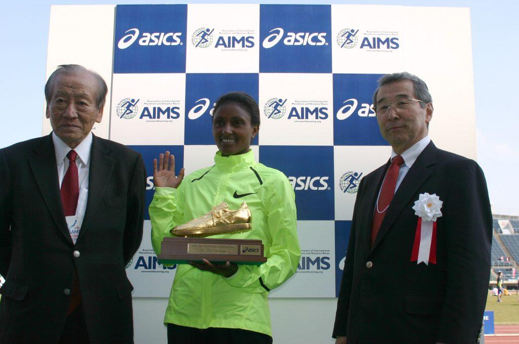President Emeritus of AIMS Hiroaki Chosa and AIMS Board Member and Vice President of the Japanese Athletics Federation Dr Keisuke Sawaki presented Tiki Gelana with the acclaimed Golden Shoe Trophy during an awards ceremony at a media event after the Kagawa Marugame Half Marathon, which took place today, Sunday, 3rd February 2013.