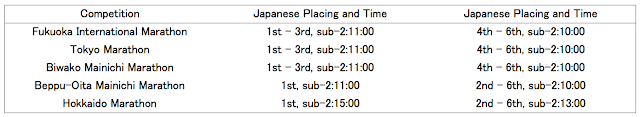 Athletes who satisfy the following requirements for Japanese finisher placing and time in the specified races.  Athletes who have already qualified for the MGC Race will not be included in the Japanese finisher placings.  [click to enlarge]