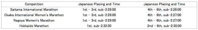 Athletes who satisfy the following requirements for Japanese finisher placing and time in the specified races.  Athletes who have already qualified for the MGC Race will not be included in the Japanese finisher placings.  [click to enlarge]