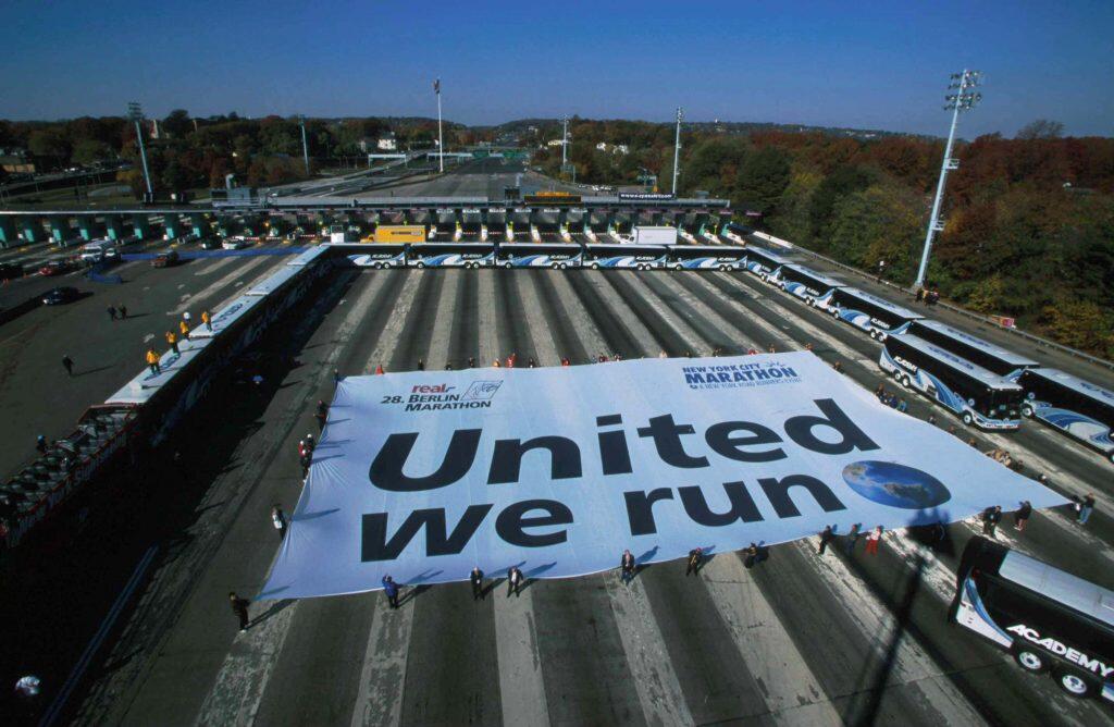 "United We Run" at the start in New York City 2001 - Berlin-Marathon and his big banner ©Victah Sailer