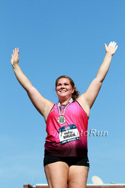 Bingson twice set the American record in the women’s hammer throw final in Des Moines. Setting a personal best by close to three meters, Bingson’s American record now stands at 75.73m/248-5. Carter, who was confident the American record would fall for her during the 2013 season, bettered a mark shared by Ramona Pagel and Jillian Camarena-Williams with a throw of 20.24m/66-5.