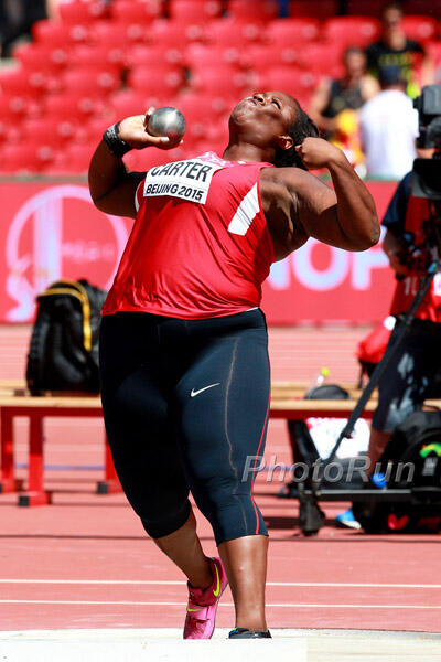 The shot put promised to be a three-way battle between Carter, Christina Schwanitz of Germany and crowd favorite Lijiao Gong of China. The trio did not disappoint, proving to be the class of the field from the first round of throwing.