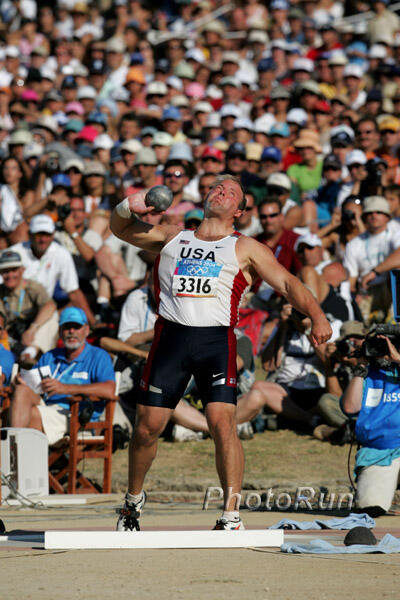 The official results of the 2004 Athens Olympics list Nelson in first place with his throw of 21.16m/69-5.25. The men's competition was held on Aug. 18, 2004 in the ancient Olympic Stadium at Olympia.