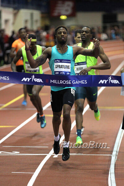 Brycen Spratling (Webster, New York) set a new 500m Armory record, an American Indoor record and an all-time world best, finishing in 1:00.06 to bring down the 28-year-old U.S. record of 1:00.17, set by Ken Lowery in 1987.
