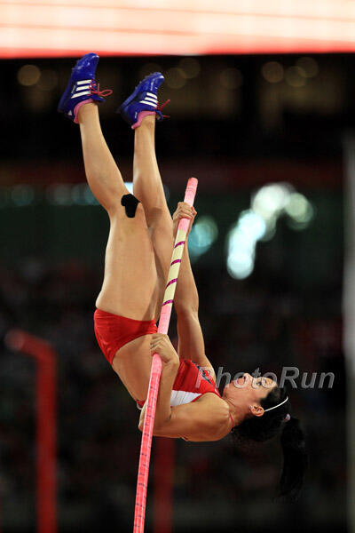 Morris (Greenville, South Carolina) made her first three bars before just nicking the crossbar at 4.75m/15-7, a height she easily cleared on her second attempt. She had first-attempt clearances at 4.80 and 4.85 before missing twice at 4.90m/16-0.75 and once at 4.95m/ on her way to earning silver. Her 4.85 equaled the best-ever height for place.