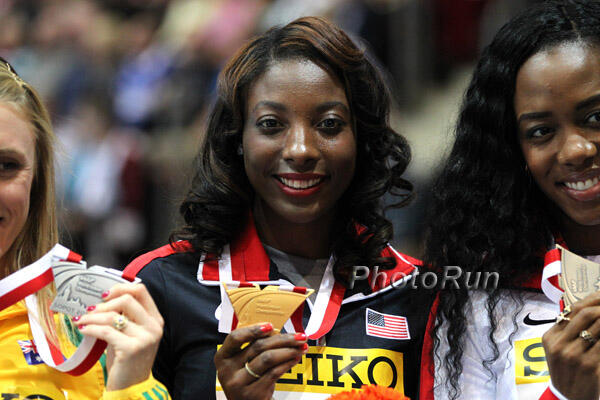 Team USA pulled off a 1-2 performance in the women’s 60m hurdles as Nia Ali (Philadelphia, Pennsylvania) defended her World Indoor title with a winning time of 7.81. 2013 World Outdoor gold medalist Brianna Rollins (Miami, Florida) was second in 7.82 and Tiffany Porter of Great Britain third in 7.90. It was Ali-Rollins from the first hurdle on as they battled for the top podium spot. Back to competitive hurdling after maternity leave, Ali took her victory lap with her 22-month-old son, Titus Maximus Tinsley, on her hip.