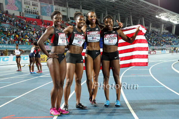 While Bartoletta, Anderson and Tarmoh have a wealth of experience on international teams, this was only Lawson’s second time wearing USA across her chest. Just 10 weeks ago, she joined Bartoletta in the women’s 60m at the IAAF World Indoor Championships in Poland. Lawson’s anchor performance in both the preliminaries and the finals in Nassau proved her position as a rising star for Team USA.