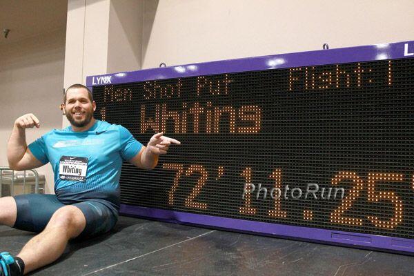 Whiting was second until his fifth throw of the meet, tossing a mark of 22.23m/72-11.25 to become the fifth-best indoor performer in the world all-time and third in the U.S. all-time. Whiting broke USA Track & Field Hall of Famer John Godina's previous mark of 21.83m/71-7.50 (2005).