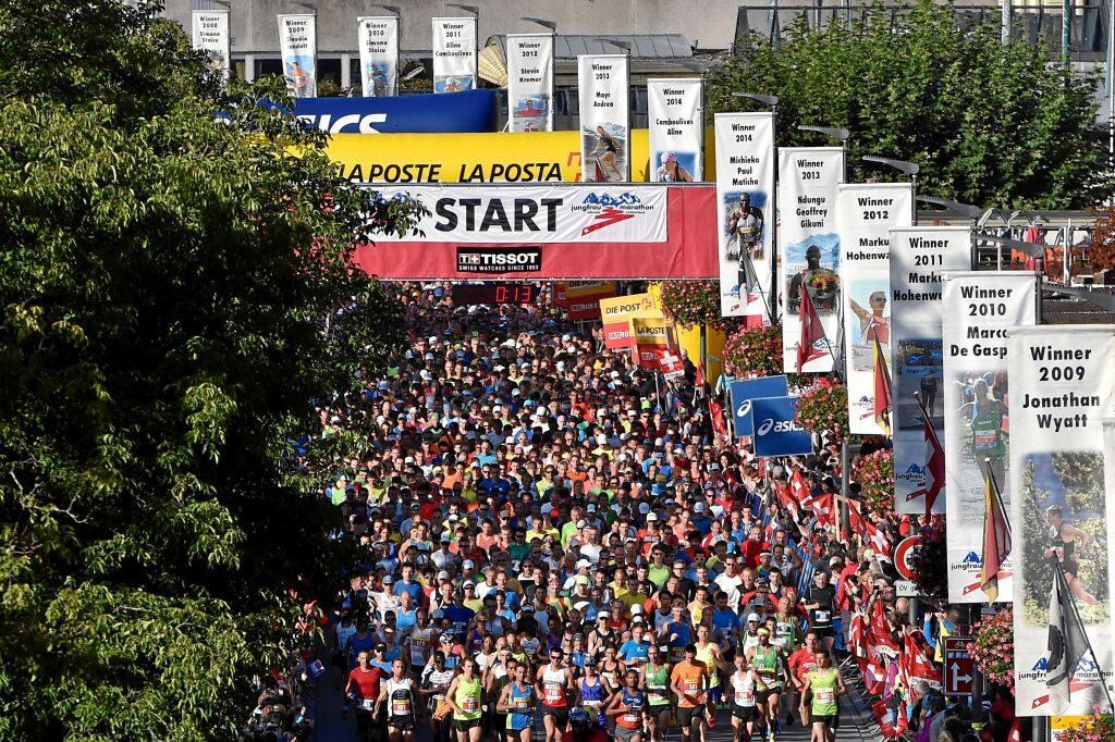 INTERLAKEN, 12SEP15 - Das Abenteuer beginnt: Start der 4000 Marathonlaeuferinnen und -laeufer zum 23. Jungfrau Marathon am 12. September 2015 in Interlaken. Impression of the 23rd Jungfrau Marathon in Interlaken, Switzerland, on Saturday, September12, 2015 swiss-image.ch/Photo Michael Buholzer