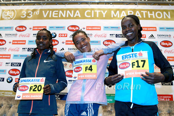 There are four other women in the race who will probably follow that pace: Fellow-Ethiopian Guteni Shone is the fastest in the field with a personal best of 2:23:32. She ran this time in Houston last year. While she had not arrived in Vienna in time for the press conference Doris Changeiywo looked ahead optimistically to her second marathon.
