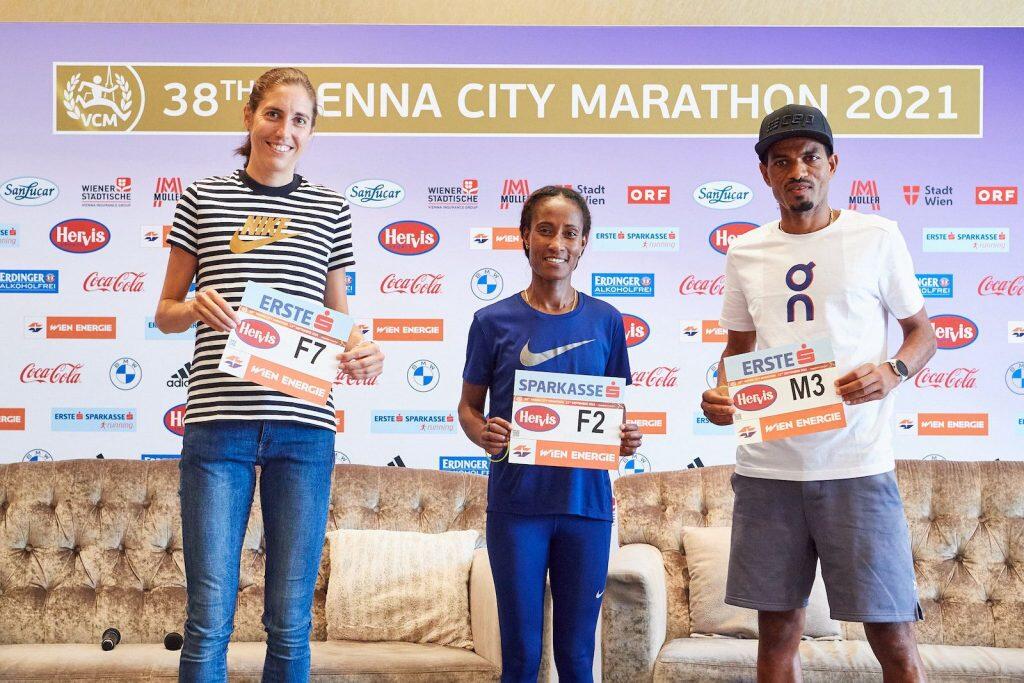 Fabienne Schlumpf, Gelete Burka and Tadesse Abraham, - Photo: VCM / Leo Hagen Vienna City Marathon 2021 Pressekonferenz, 10.09.2021, Wien