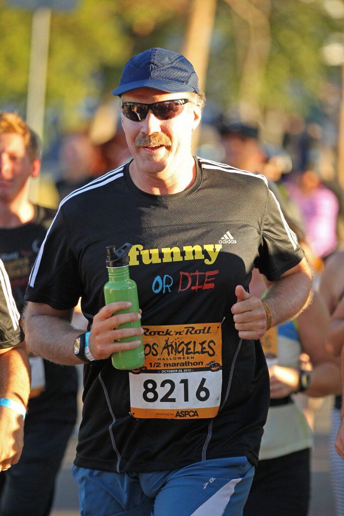 LOS ANGELES – (October 28, 2012) – At 6 feet 3 inches Actor Will Ferrell stood out among 12,000 runners in costume at the start line of yesterday's Rock 'n' Roll Los Angeles Halloween Half Marathon benefiting the ASPCA on Sunday morning, October 28. Sporting a "Ron Burgundy" mustache and a "Funny or Die" branded T-shirt, the 45-year-old move star finished the 13.1-mile race in 2 hours, 3 minutes and 50 seconds.