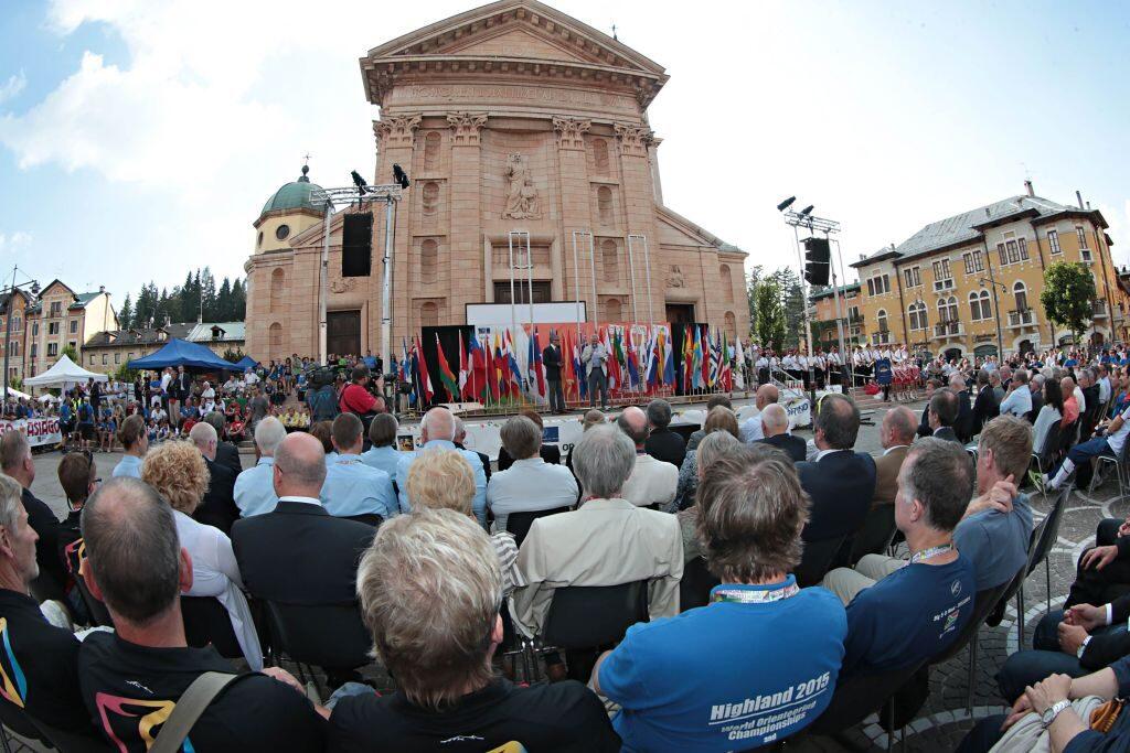 Representatives of 54 nations paraded through Asiago streets and gathered in the main square, in front of the St. Matthew’s cathedral, all shouting and enjoying the warmth of the fans and tourists. Some local authorities took the floor too, among them Roberto Rigoni Stern (Asiago Mayor), Gian Pietro Mazzeni (OC President) and Marino Finozzi (Councillor for Tourism of Veneto region). After the IOF flag was raised, the new Sprint world champions Judith Wyder and Soren Bobach finally wore their gold medals, and the rest of yesterday’s podium was also awarded.