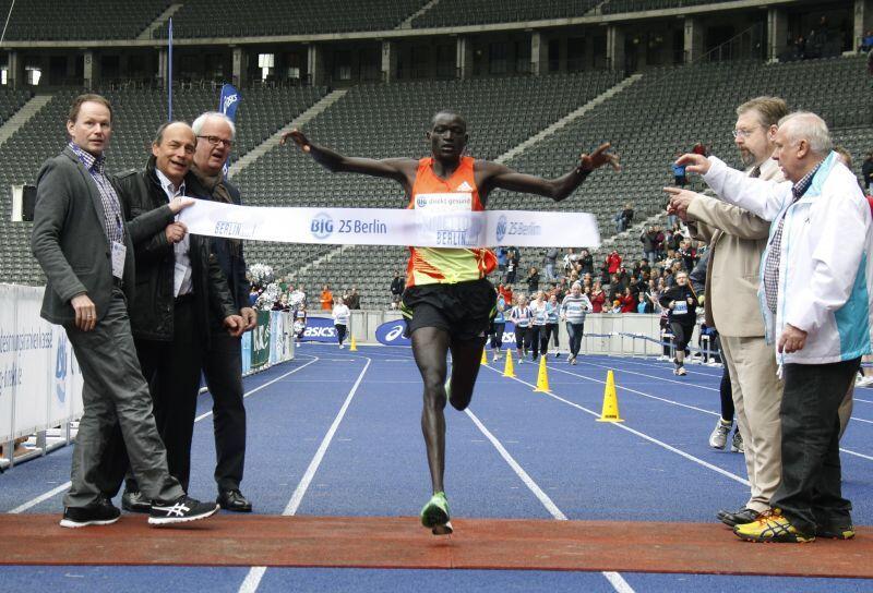 06.05.2012 BIG 25 Berlin 2012 Mit Start und Ziel am und im Olympiastadion Sieger - Maenner Dennis Kipruto Kimetto -EN- [ Foto Juergen Engler 0172-3015590 Kurfuerstenstrasse 60 10785 Berlin mit 7% Mw-Steuer, Honorarpflichtig Steuer-Nr.: 34-277-51599 Finanzamt Mitte / Tiergarten Commerzbank Konto-Nr.: 40 30 461 00 BLZ 100 800 00 IBAN : DE08 1008 0000 0403 0461 00 BIC : Dres DE FF 100 www.pressefoto-engler.de Pressefoto-engler@t-online.de ]