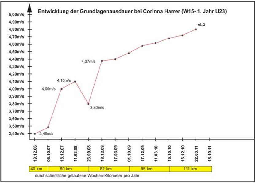 Grundlagenausdauer wird über Quantität (Umfang) und Qualität (Schwellentraining), über den kurzen Tempo-Dauerlauf (4 ? 10 km aufbauend) und extensives Intervalltraining entwickelt. Eine Steigerung des Umfanges ist pro Jahr um zirka 10-20 % sinnvoll. Messungen haben ergeben, dass sich die vL3 bei einigermaßen störungsfreier Entwicklung um zirka 0,2-0,3 m/s pro Jahr weiterentwickeln lässt. Für die ausdauerabhängigen Dis-ziplinen 1500 – 5000m ist für Spitzenleistungen der Frauen beispielsweise eine aerobe Schwelle um 4,8 – 5,0 m/s erforderlich. (siehe Tabelle C. Harrer