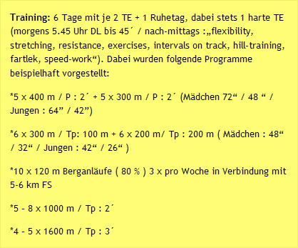 Bei einem von ihm gezeigten Video über das Training habe ich folgende Stichpunkte notiert: DL + FS im Gelände: barfuß – Bodenwechsel, Rhythmuswechsel, stark profiliert, z.T. steil bergauf und bergab, große Gruppe; Treppenarbeit, Gymnastik während des Laufens wie in Äthiopien, große Schritte, Beweglichkeit.
