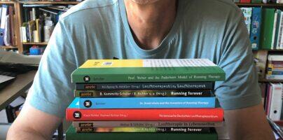 Am Ende sind es genau 242 Seiten geworden, die der Autor und Lauftherapie-Jubilar erstellt hat – sparsam garniert mit Fotos wie auf der allerletzten Seite, wo Schüler selbst mit seinen Büchern sitzend postiert ist und uns mit einem Schmunzeln die Frage beantwortet: „Wann sollte man aufhören, Bücher zu schreiben?“