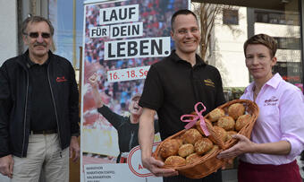 Leckerer Vorgeschmack auf den E.ON Kassel Marathon 2016: die exklusiven Marathon-Brötchen von Bäcker Becker, präsentiert von Andreas und Susanne Becker und Marathon-Chef Winfried Aufenanger. ©Michael Küppers