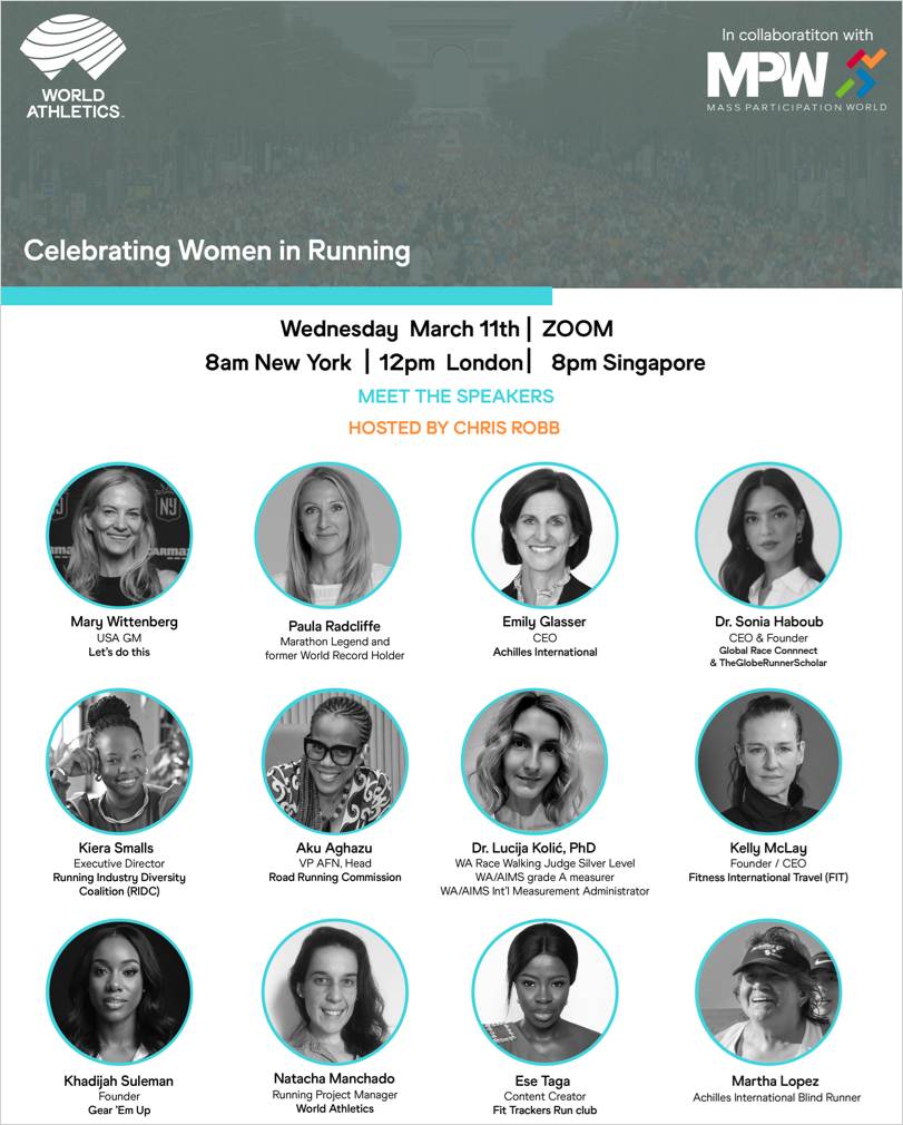 in der Woche nach dem Internationalen Frauentag freuen wir uns, Ihnen wieder unsere Sonderausgabe „Celebrating Women in Running” der World Athletics Road Race Webinar Series präsentieren zu können, die in Zusammenarbeit mit Mass Participation World und unter der Leitung von Natacha Manchado und Chris Robb entstanden ist.